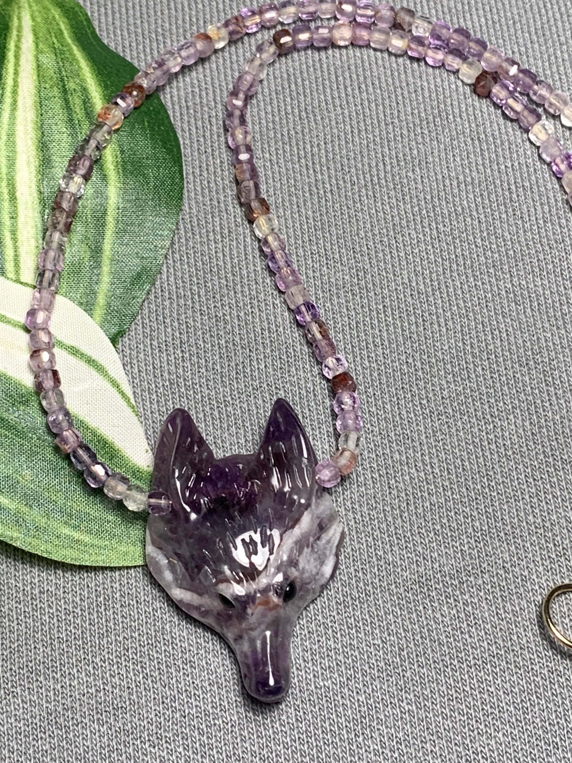 This stunning Amethyst Gemstone Wolf Necklace is hand-carved with powerful super seven cube beads, emanating wolfpack energy and a sense of protection. The unique and beautiful combination features a wolf pendant and high vibrations that will elevate your mood. Perfect for those seeking a touch of natural beauty and spiritual energy.