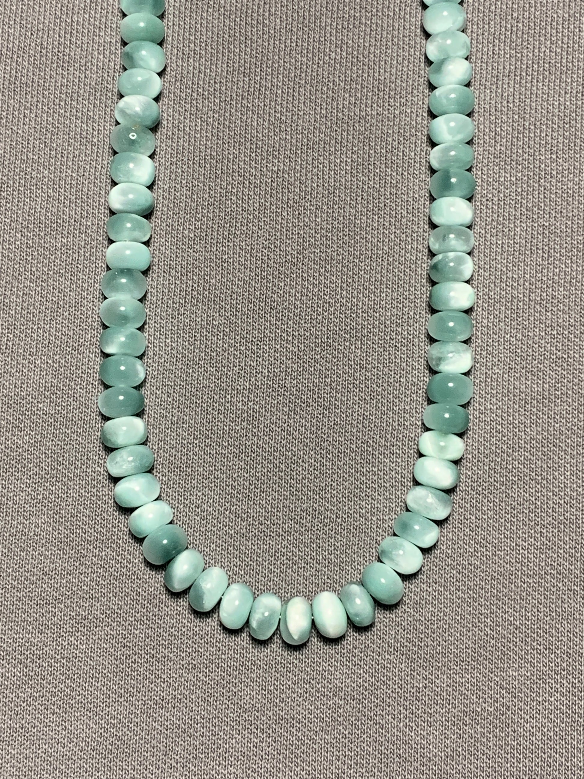 This enchanting Green Moonstone offers a beautiful green/blue depth and white chatoyancy (aka cat's eye effect) for a truly magical piece. Get lost in the unique qualities of each and every bead, and strut with emboldened confidence when you wear this one-of-a-kind necklace. Moonstone is said to assist with growth, new beginnings and manifestation.