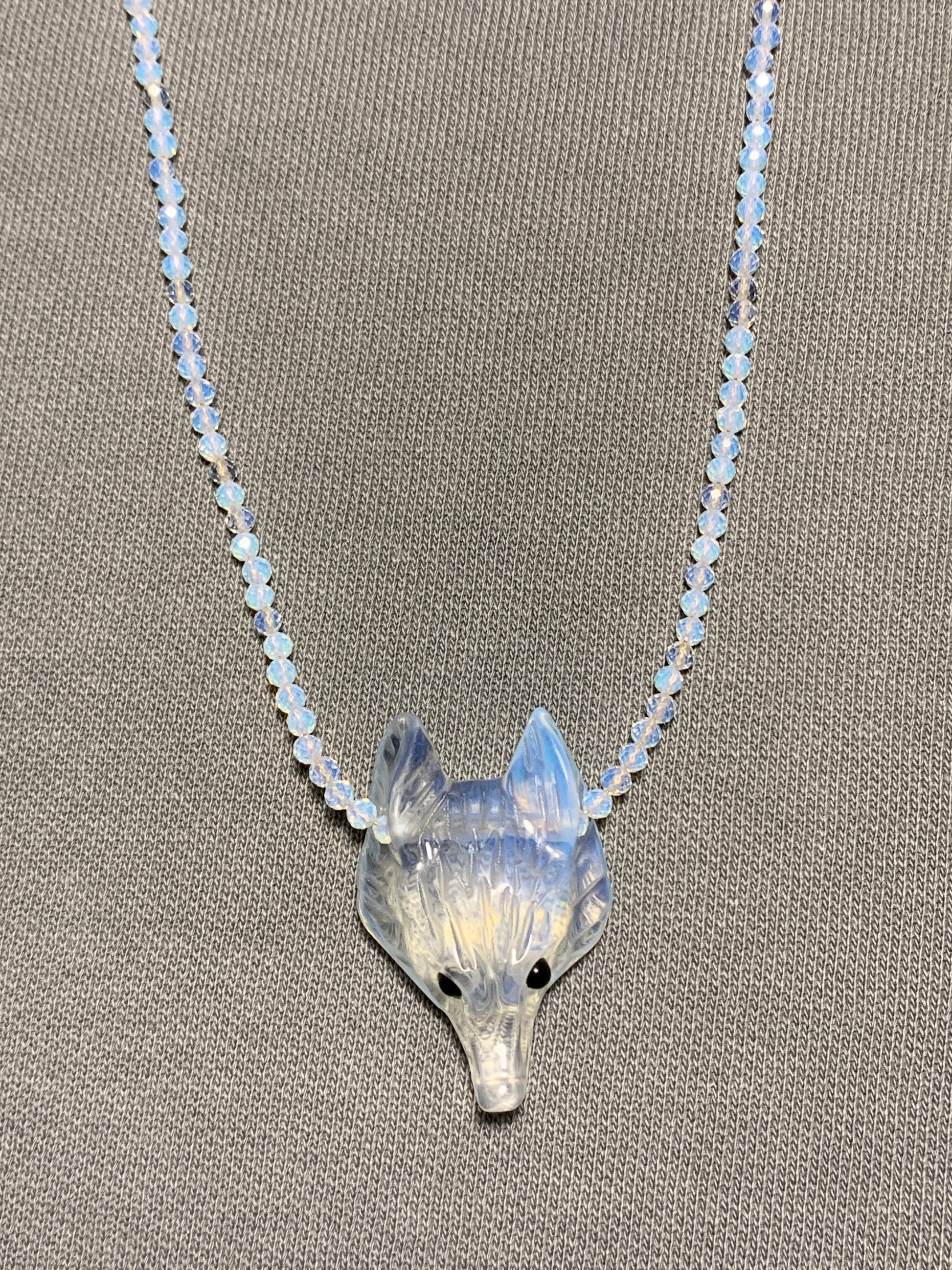 Embrace the wild with our Opalite Wolf Gemstone Pendant Necklace. Its hand-carved opalite wolf pendant and sparkling round beads dazzle in the sunlight, embodying the powerful energy of the wolfpack. Add a fun vibe to any outfit with this unique, handmade beaded jewelry, crafted with love.