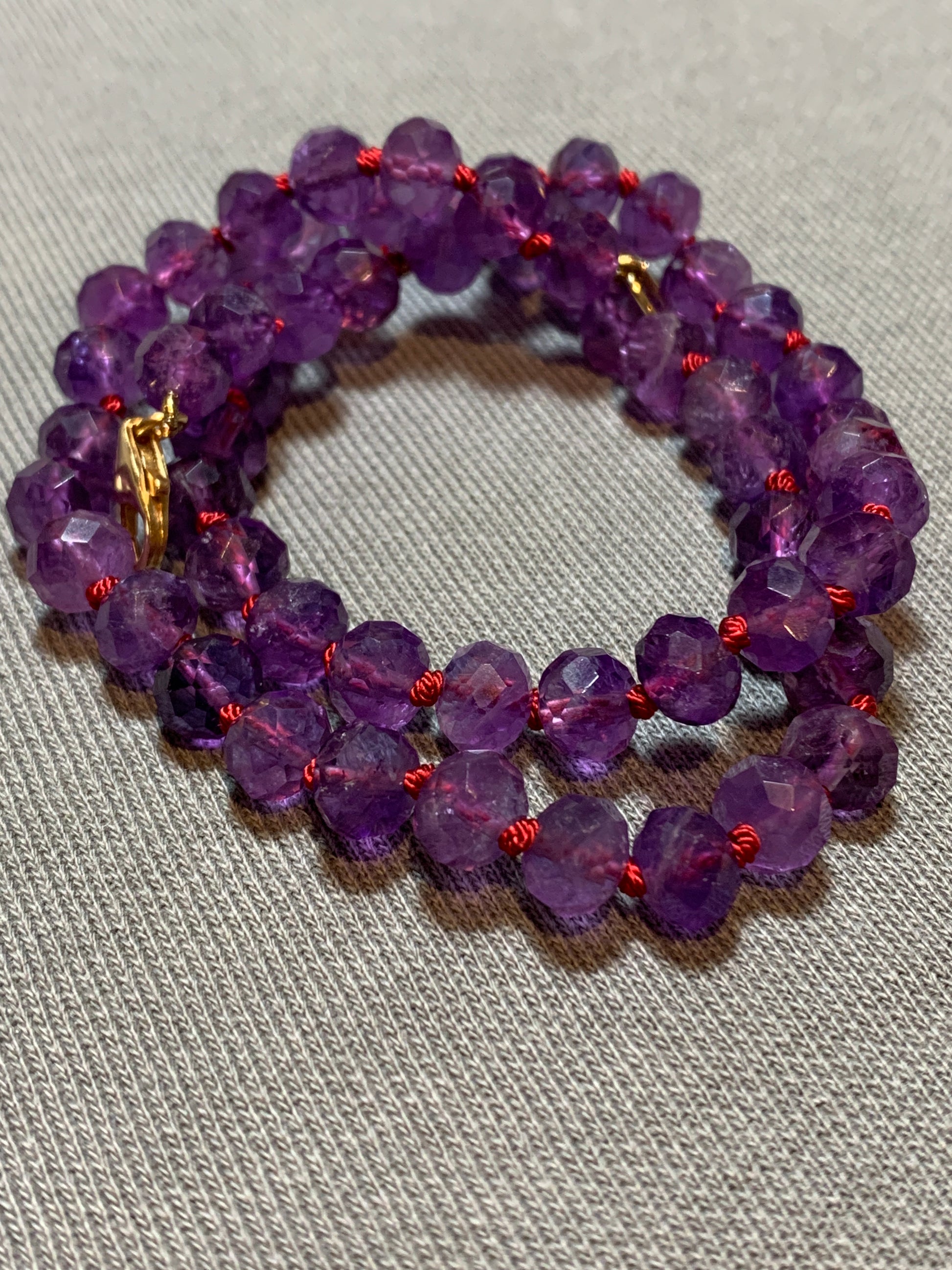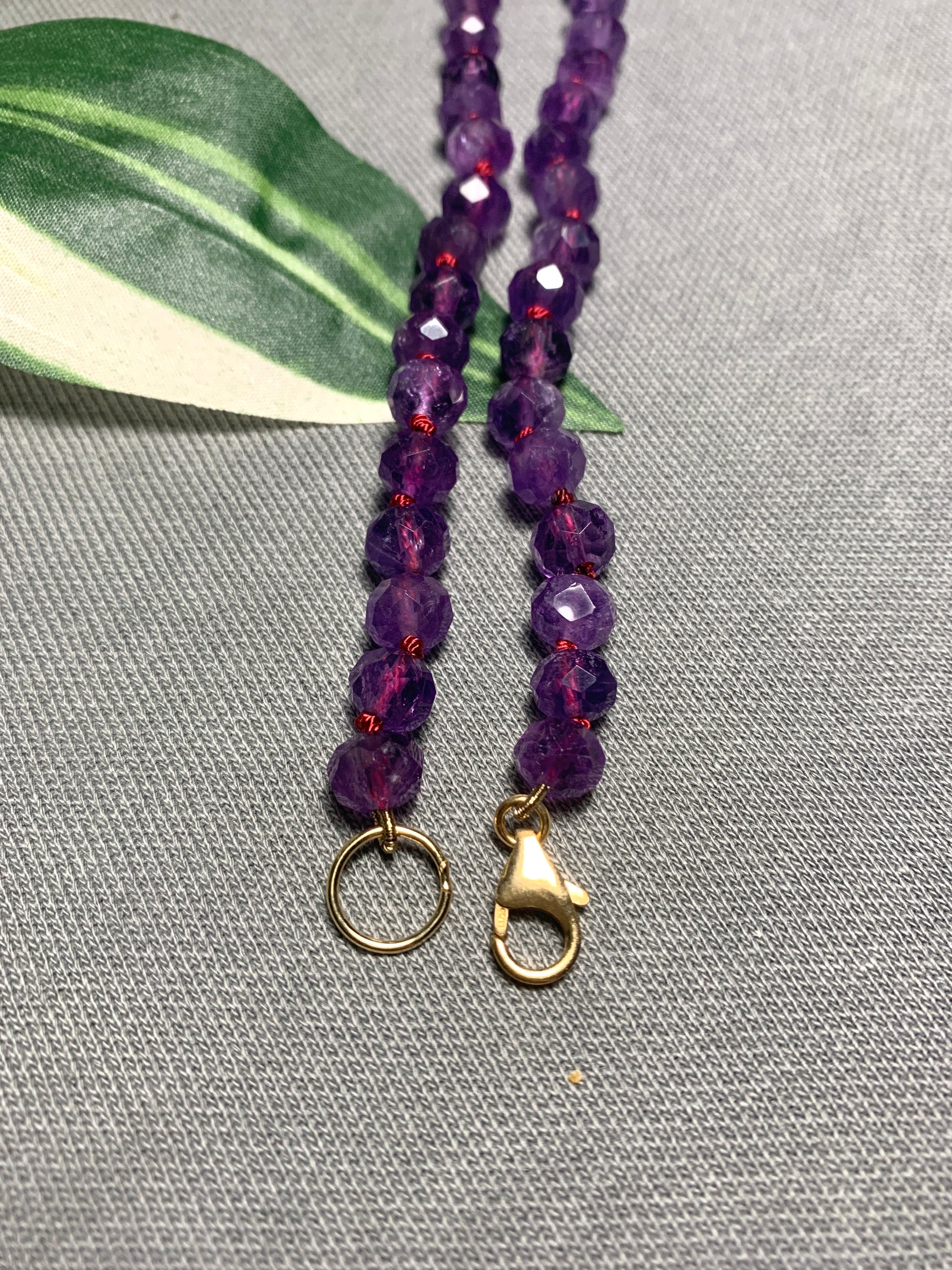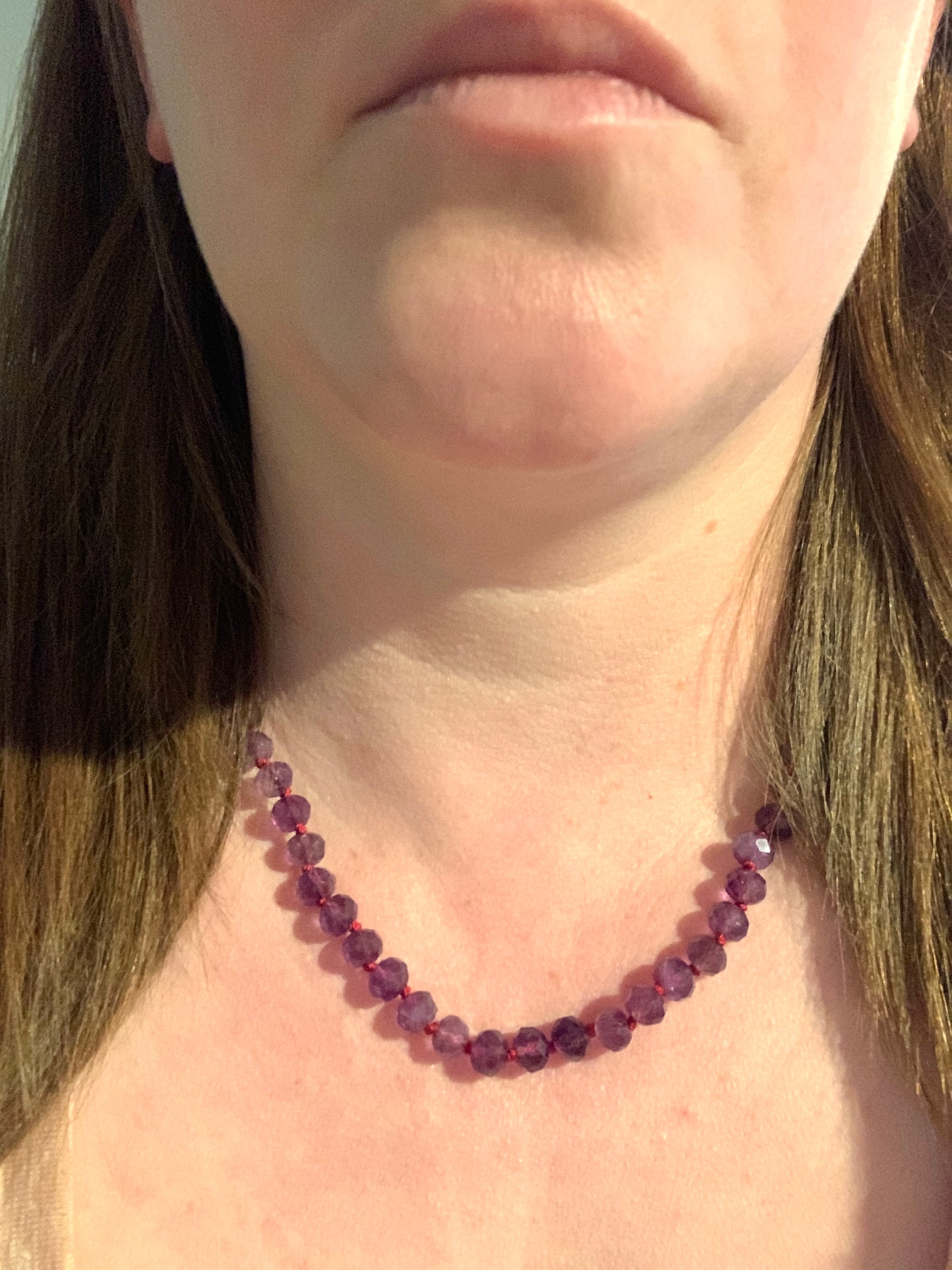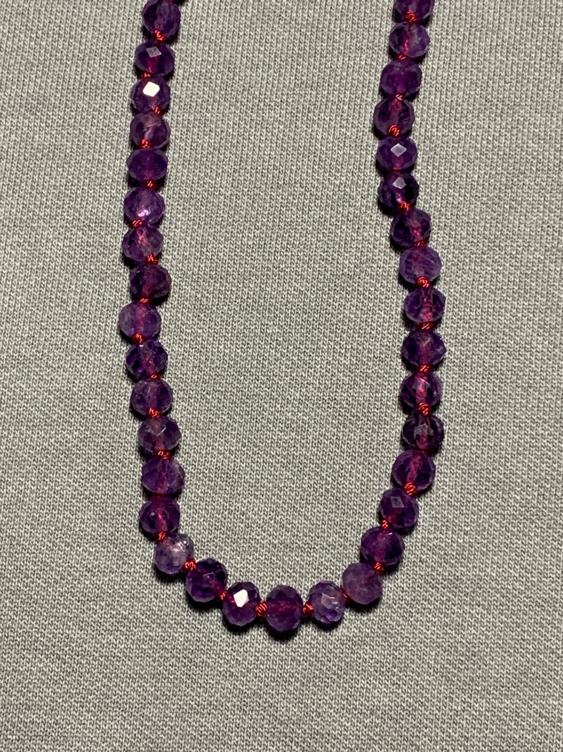 This amethyst necklace features beautifully cut AAA amethyst beads on a berry colored silk thread. This necklace is sure to get some looks when you wear it out on the town with your best pals. Amethyst is said to bring inner peace and alleviate sadness.