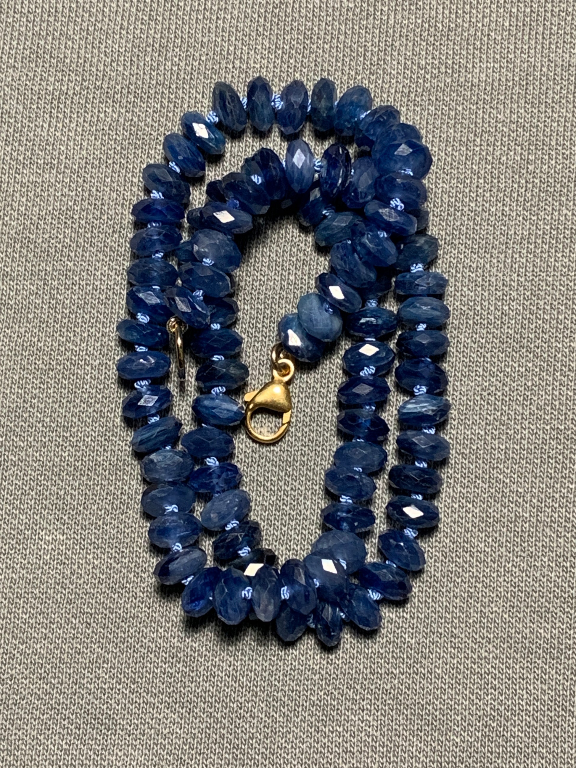 This version of our fan favorite stunning blue kyanite features the most gorgeous sparkle. The faceted cut of the bead showcases maximum glitter and shine. Kyanite offers a nice weight, as well as a perfect drape with the silk knots between each bead. Kyanite is said to boost creativity and clarity!
